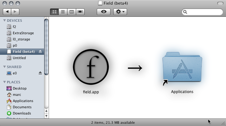 Simply drag the Field application icon to the handy Applications directory shortcut to install Field.