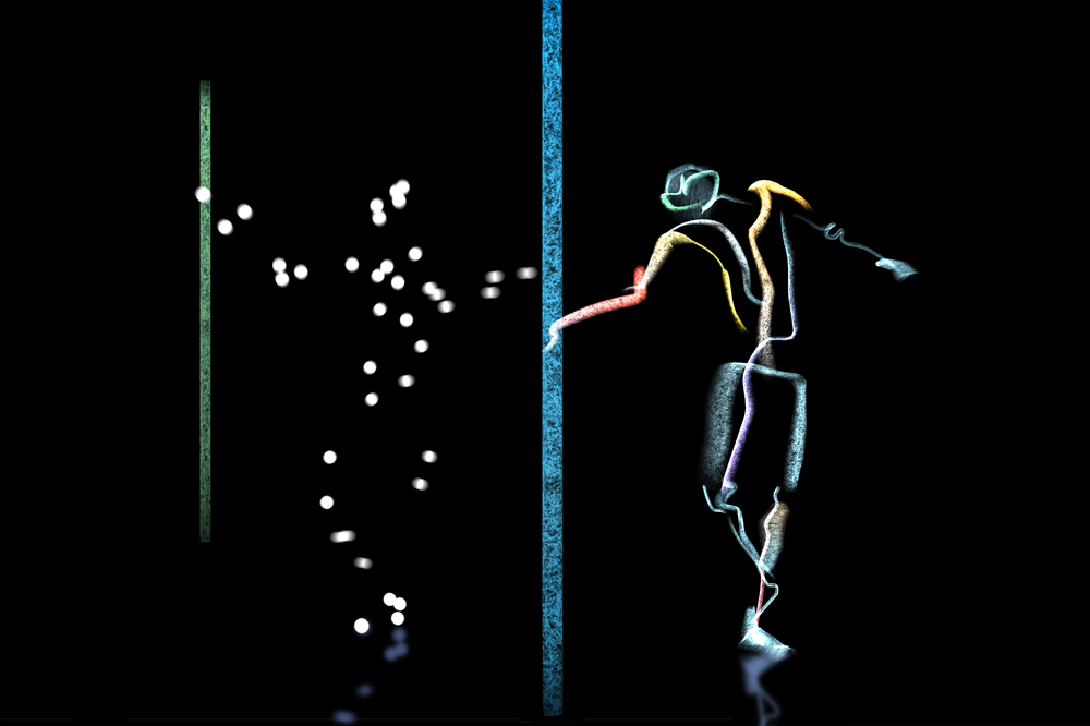 Actually, we had two themes in mind, one for figure and the other for ground. For the figure, we wanted to create a much larger variety of virtual anatomies. These included variations on the hand-drawn bodies we had made for Hand-drawn Spaces, but they also went far beyond that. We had dot bodies (from the dots seen in motion-capture), stick bodies (inspired by the yarrow sticks cast by I Ching practitioners like Cunningham and Cage), and cubist/chronophotograph bodies (our nod towards Marey and Duchamp). Having motion-captured about five minutes of the BIPED choreography, we now used it to animate our figures much more freely than in Hand-drawn Spaces. Freely, but still truly: we took care never to lose the underlying perception of real and plausible human movement.