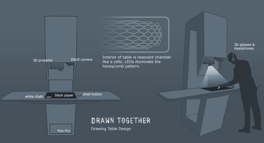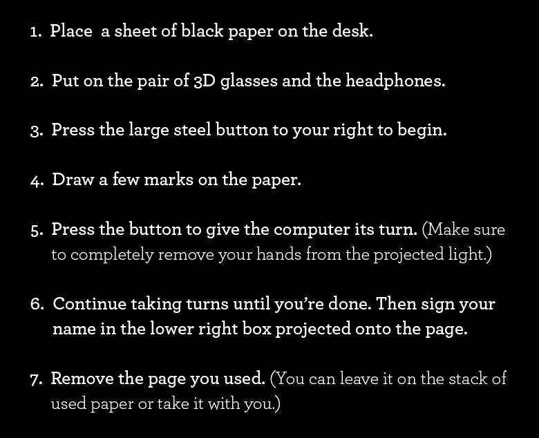 Here’s how it works. The physical manifestation of the installation, which echoes that of a drafting table, presents you with a variety of white drawing implements (chalk, gel-pen, pastel) with which you draw on a piece of black paper. While drawing you are also to put on headphones and a pair of 3d glasses.