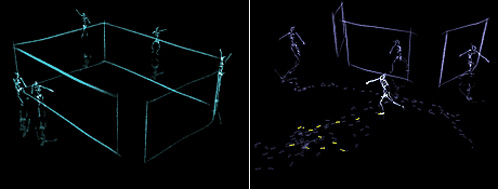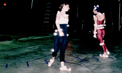 The phrases were all captured at the Biovision studio in San Francisco, now defunct and at the time primarily used for videogame capture (note the concrete floors). The infrared cameras tracked the position of the reflective markers positioned on each dancer, but could do so for only 25 seconds at a time.