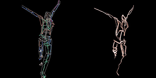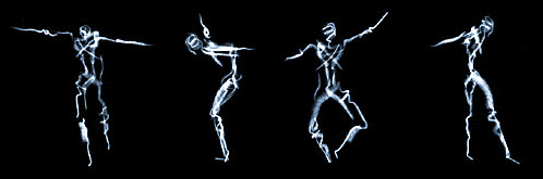 Shelley Eshkar created a set of five hand-drawn figures to carry the movements Merce had set on the bipeds. He studied the Cunningham movements, then devised figures to emphasize such things as “wingspan,” elevation, pivot point.