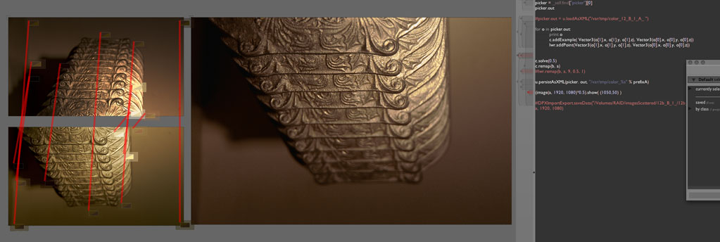 On the left we see the two source images (our half-silvered mirror also flips the image as well). On the right, our remapped image. It should, if everything is going correctly, have the same color quality as the image on the top, but contain the same image as the image on the bottom. Above all, we want to get to the point where we can see if our RBF idea is any good as soon as possible in as little code as possible, but with an interface that, if it does work, we'll have to live with for 60-70 shots.