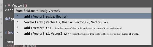 What isn't clear from the screenshot is that you can keep typing while you have this menu up and it will refine itself to include only results that start with what you have written. Backspace, enter (to accept the proposed completion), escape (to forget about the whole thing) and the up and down arrow keys (to choose from the menu without using the mouse) all work as expected. Tapping option shows and hides those 'private' members. Refining your search to the point where only a few options remain will focus the display on the documentation for those things (taken from parsing the JavaDocs for Java things, or from the documentation comments of Python things) and will, in the case of short Java methods, show you source for the method itself.