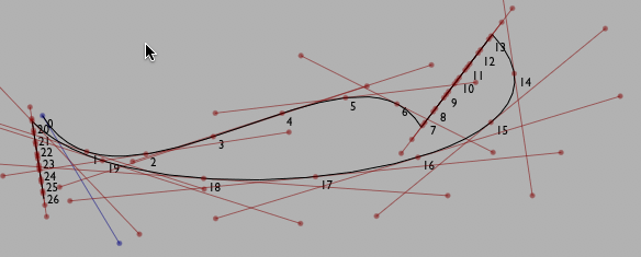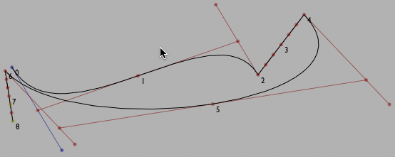 .forwardT(dt) moves a cursor forward by an amount dt (backward for negative dt). There's also .backwardT(dt) which goes the other way. But what units is this 'T' in? Spline Parameter units. Note that each time around the for loop above we move forward by 0.1 — the first 10 points we draw are in the first curve segment, the first 10 are in the next segment (which is a straight line) and so on. 0.1 corresponds to 10% through the curve, regardless of the length of the curve. Thus the points in the second segment are much closer together than the first. In fact the points aren't typically evenly spaced within a curve segment (which you might be able to see in the third curve segment).