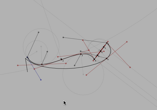 Since these tangents are really a 'velocity' of how the line is 'moving' at a particular point, we can also build the 'acceleration' — .accelerationForward() and .accelerationBackward(). We can use the curvatures to draw osculating circles: