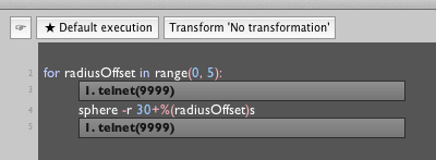 The first example is from Forest, a 5 screen, 5 GPU / CPU artwork. In Forest we introduce a block transformation that can cause the text "transformed" to be executed on a different Field process, running on a different computer. This uses networking code that's entirely standard to the Python library. The second example is integration between Field and Maya, which, in the case of its proprietary scripting language "MEL" allows commands to be sent across a telnet port. Using a text transformation we can embed this foreign language directly into Field's text editor:
