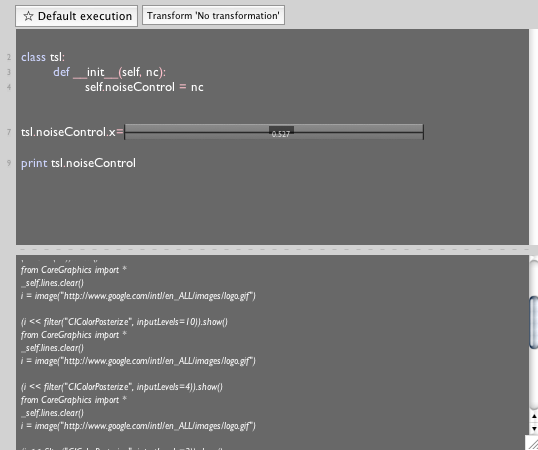 Here we set a variable "equal" to a slider. Slide the slider, and re-execute that line, and the variable has changed (and see below). You get a menu of these with a right click. These elements flow within the body of the text itself and the text insertion point simply skips over them; they can be copied and pasted like text (#20), deleted like text etc.. The rule is simple: the graphical object can be as graphical and as interactive as it needs to be, but in return it must to be able to convert itself to text on demand — Python is still a text-based language after all, and, as stated previously, we choose to operate under the constraint that this language remain completely standard. So, at some level this text editor (and anything else in the delegation graph) still believes that it's editing text. To help maintain this charade, the graphical object gets to convert itself to both text and a small persistent "cookie" (a property, of course) which helps with the conversion back to UI element if needs be. Importantly the UI element needs to be dedicated to "being text" convincingly since should this element not be present in the editor, the cost of instantiating UI elements is never paid.