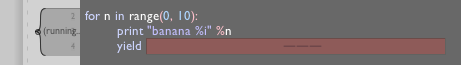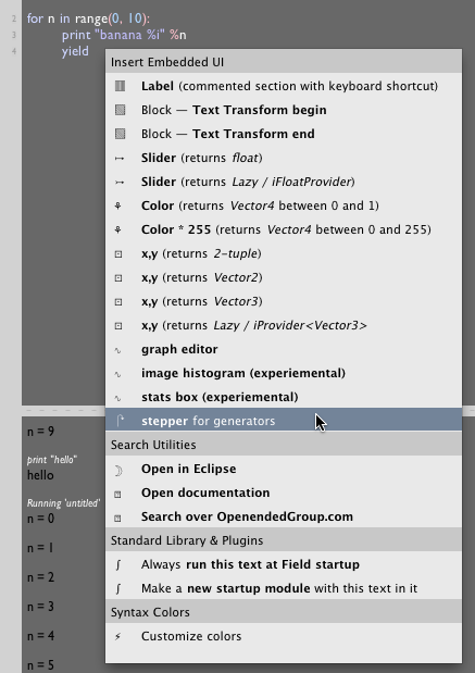 One final note, now that in the latest version of Jython (the Java-python that Field uses), yield is an expression not a statement, that is: yield can return a value. We're on the verge of extending the idea of a Stepper to include just a little bit of UI: a slider, a text box, things like that. The value you select will be the value 'returned' by the yield expression.