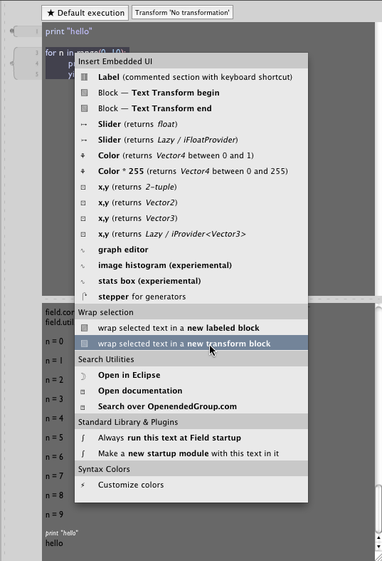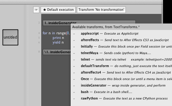 Now we have a Text Transform that takes the text inside it and, wraps it up in the right kind of environment, and submits it to Fields central update cycle. We can execute this text transform by hitting command-1 while the cursor is inside it (or near it) in the Text Editor (the '1' in command-1 comes from the annotation 1. insideGenerator \1. insideGenerator, you could change that to read 2 if you wanted a different keyboard shortcut. You can also, following convention, option-click the top transform.