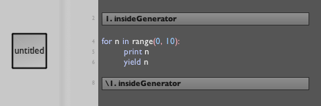 Finally, one concept that's universal to Field's treatment of Generators — their execution environment. Rather than just calling a generator each 'frame' Field pays attention to what that Generator yields. If it yields something 'interesting', like another generator, Field forms a stack and adds this new generator to the head of it. Next time around that generator gets called; until it's done, the stack is popped and 'control' is passed back to the original generator. This is such a good idea that many people have invented it on their own, not least of all the Python people themselves (it's examples 3 in the Generator documentation).