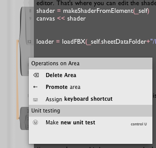 Autocompletion — Who likes typing out the names of variables and classes? We don't. command--period looks at what's on the left hand side of the cursor and pops up a menu of possible things you could have typed. Just start moving down or up with the arrow keys or keep typing to narrow the options a little more. Autocompletion will also show you fields that are hidden if you tap the option key.