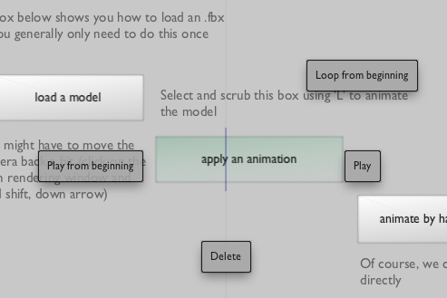 L — the L key makes a new time slider just the the red one except: 1) it's blue, and 2) it only effects the boxes you have selected at the time you push 'L'. Pressing L again makes it go away, but you can right-click on the slider to start it looping and so on. Once you've done that, the K key controls this "disposable" time slider.