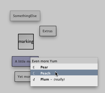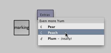 Marking menus have already been in Field for the last few months in one place — OptionClicking (we'll update that page once beta 9 is live). But we now have a generic system for building marking menus and, a little like Maya, marking menus that pop up menus, for when you want to cluster things together and forego some of the benefits of the "pure" marking approach.