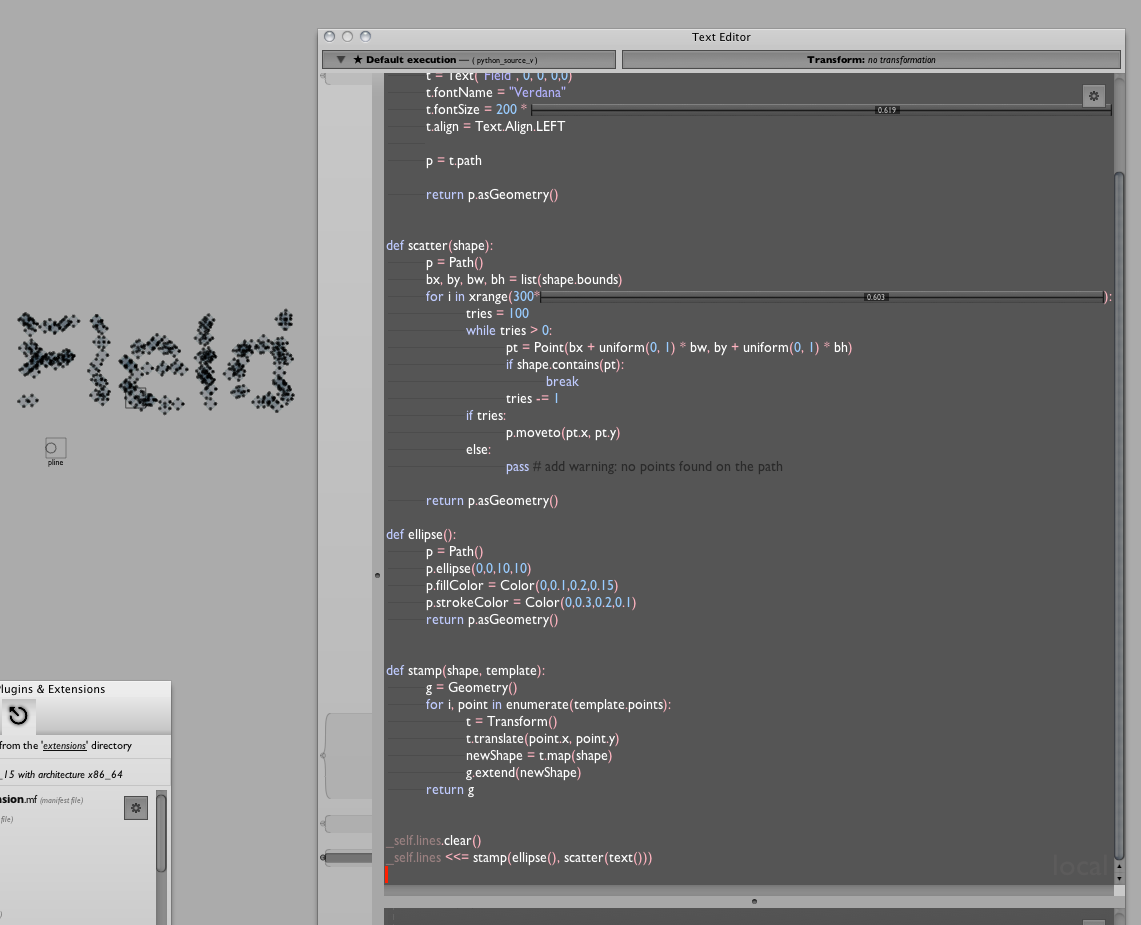 Voila! The heart of NodeBox inside Field. You can see in the screen shot that we've been unable to resist putting in a couple of embedded sliders directly into our code. Now, whether you like prefer typing stamp(ellipse(), scatter(text())) or connecting boxes together is up to you...
