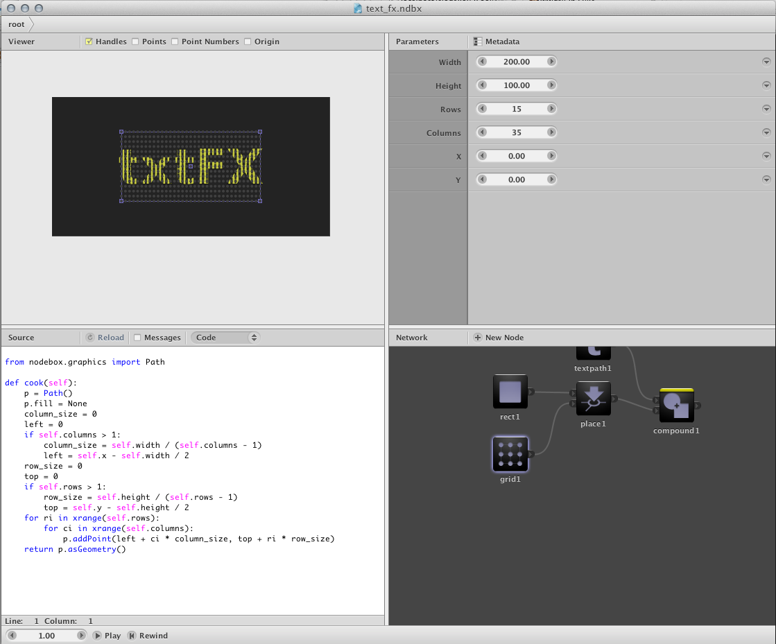 Well, that was easy (really, with auto-completion and 'print' it took all of 5 mins). But hacking into NodeBox at this level misses a lot of the interesting part of their libraries — in particular it misses the compositional nature of their "network". While we have mixed feelings about node-based editing interfaces we certainly like node-based abstraction.
