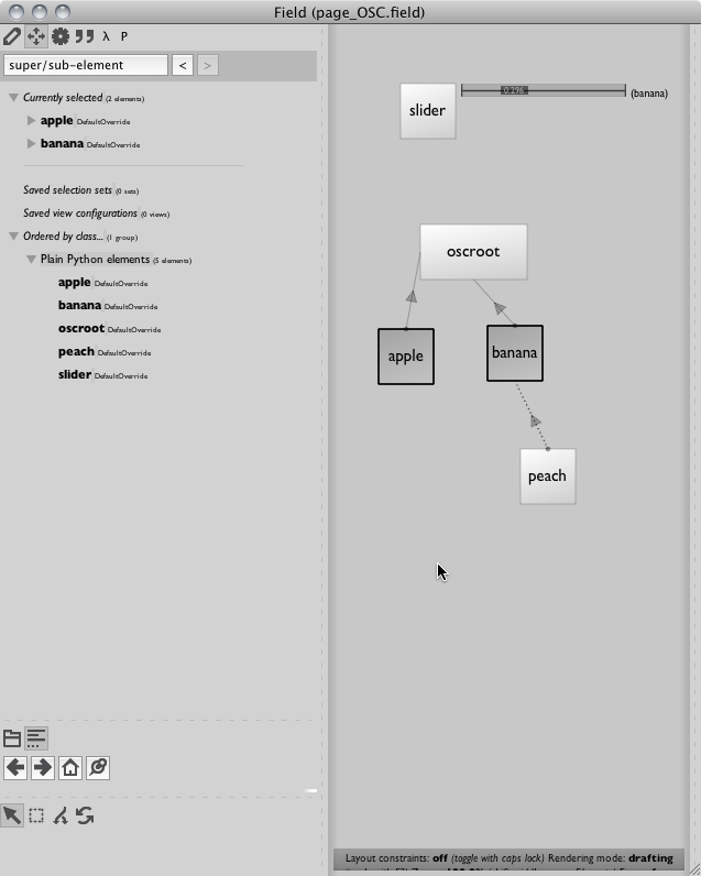 Because of this popularity using OSC in Field is already extremely straightforward — just take your pick of Java-based or Pure-Python based OSC libraries, tell Field where they are located and then start writing code that uses them. But because of its importance as the glue that links interesting environments, and because Field is all about gluing things together, we've added a simple Field-ish OSC Plugin to the standard Field distribution. You are of course free to ignore the plugin and continue using your own OSC library.