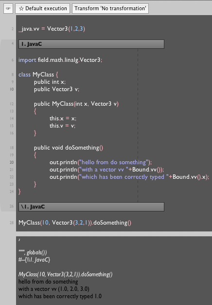 Bound.name(). For other variables there's the static namespace Bound. To offer variables up to this interface, use code like you see above: _self.java.someVariable = someValue. To access this from Java say Bound.someVariable() (note the (), this is a method call not a field). The contents of this transient class Bound is automatically made out of the contents of the magic variable _java just before you compile the code — the value of the variable is used to determine the class it presents to Java's type system. For other languages we have similar magic objects in the Python namespace (for example, _clojure).