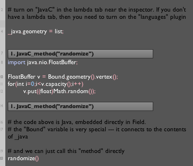This Text transform defines a parameterless method (here 'randomize') that you can just call from Python like any other function. You'll also note that some of the embedded GUI elements work just fine (specifically the ones that don't use Python's magic to get their task done). If you really wanted to you could make a new Text Transform that turned around and called the JavaC transform that would do away with the outer class declaration — instantly you have something that resembles Processing. In fact, this is such a good idea that you'll find just this feature in Beta 10 and above (see ProcessingIntegrationFourWays).