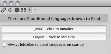 These experiments are ongoing, but more recently, with Field's move to the Java 6 JDK, we've been able to rapidly open up Field to alternative languages. Our current work in this domain is represented in the jsrscripting plugin. Right now we are playing with JRuby, Mirah, JavaScript, Scala, Clojure and, oddly enough, Java itself.