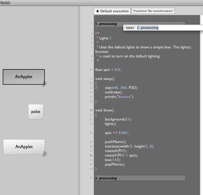 Now we have a new "text transform" that let's us write Processing code directly in Field — not Python, not Java, but actual Processing code that goes through the PDE parser and comes out as an pseudo-applet.