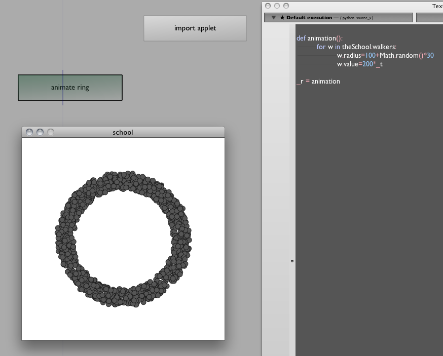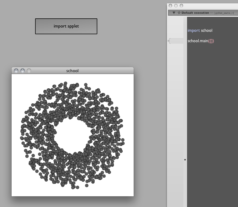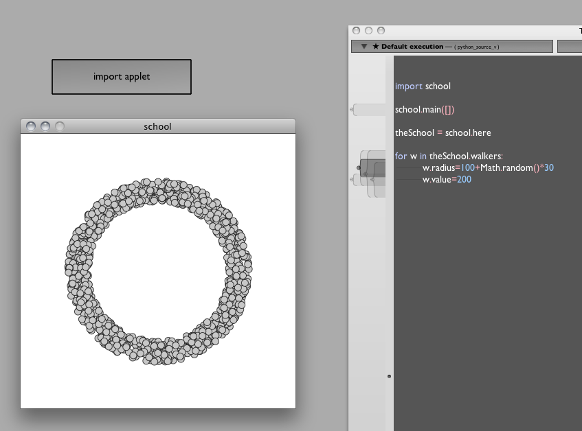 We've introduced a variable inside the Processing code that lets us grab hold of the Applet that Processing makes. Now that we have the applet, we can do absolutely anything we like to the running applet. For example, to play with the shape of the "school":