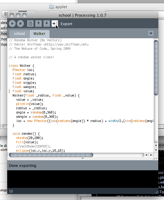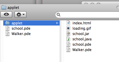 This gets you a nice little directory with your .pde files, the .java source versions of them and, most importantly a .jar containing your work.