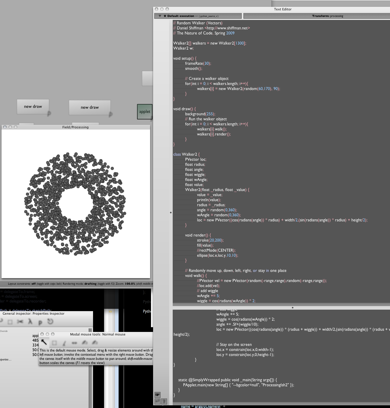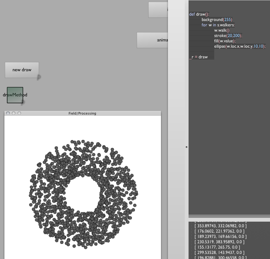 That's a rewrite of draw(). Note that we've reused all of the non-Processing specific code inside the Walker class, and moved the drawing code to Field/Python. In the common case where w.walk() is some kind of big, super-sophisticated thing that requires the speed of pure-Java to run, while the actual drawing code is something that we want to actively tweak and refine, this split works very well. We keep our fast "simulation" code completely untouched (and completely fast) while moving our drawing code into the dynamic, rewrite it as you go world of Field.