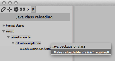 Right clicking on any art of the hierarchy — package or class — allows you to install a "class reloading domain" at that point.