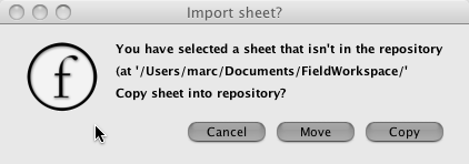 field files want to live in the workspaceAt the time of first launch Field asks you to select a workspace. This is the place that Field wants to put all of the field files that it creates. Field will complain if you open a field file from somewhere else: