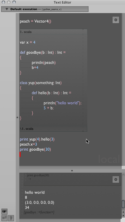In keeping with Field's goal of being a truly experimental platform for writing code, it's always been a given that we're interested in programing languages as a first-class concern (you can see this in our Python-based wriggling around). This is part of what drove us to make the block transforms elements in the text editor in the first place. These elements allow you to make "local languages" because when they are executed they are actually passed off to a (Python) function of your choosing. It's simple to then pass the code to a network socket (for example for Maya integration) or to AppleScript to poke and prod applications across the operating system.