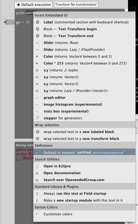 To emphasize and support this use of the global namespace, Field does something very unexpected (but useful) — it automatically executes elements needed to resolve global definitions (and variables). If I have a visual element 'A' that is known to def foo():, or set bar=10 and I have some other box 'B' that says foo() or print bar then just before that NameError would get thrown, element 'A' is executed in its entirety.