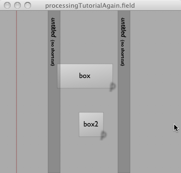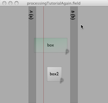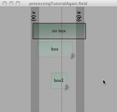 This ends the main body of this teaser-tutorial. Hopefully this is enough to let your enthusiasm take you further. You should look at the text editor which has all kinds of things to help you write code quickly and experiementally (don't miss the auto-complete), the canvas where you'll create boxes (and interactive diagrams, and images and so on). For some more Processing -> Field related documentation (and some observations about the differences between these envrionments) see here. To jump straight to some example Processing / Field code, go here.