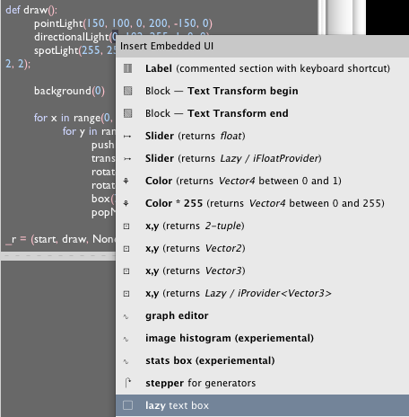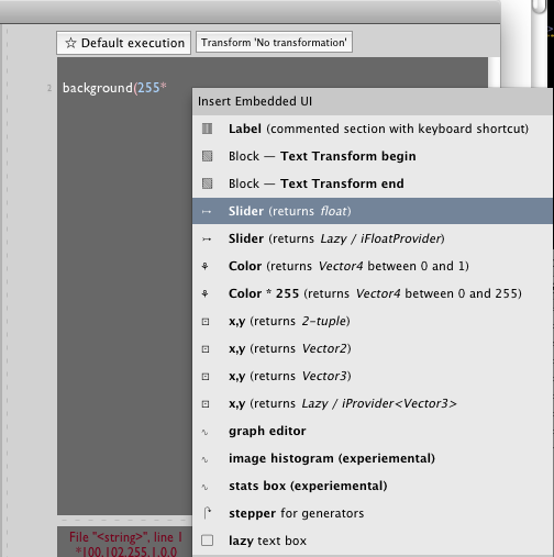 The truth of digital art is that you spend as least as much the time "exploring" the code that generates an artwork as you do writing the code in the first place. Much work is dedicated to finding the value of parameters. Things like these sliders speak directly to making this experimentation happen as fast as possible. Thus, all kinds of things can be embedded in the text editor, and we're very open to hear future suggestions. Take a look at the growing documentation for the embeddable-GUI elements at EmbeddingGui .