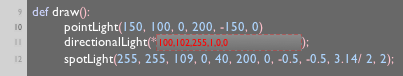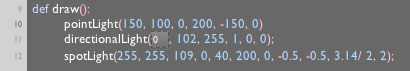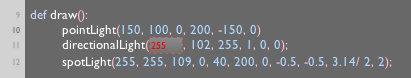 Other than an inexplicable love of the number 255 held by the library creators, some features stand out. The "library designer" who had to make up his mind about how to implement spotLight here is in a bad spot. He has to choose between adding features (say, the angle and focus of the light) and avoiding secret knowledge (what all those parameters actually mean). Because this is example code, there are comments. But I know that if I was writing this code curled up on the floor in a machine closet of a gallery somewhere, or renting theater time I know two things for sure: a) I would have to look up what the 4th parameter of spotLight was (quick: does the direction come before or after the position of the light?) and b) I wouldn't bother writing the comments.