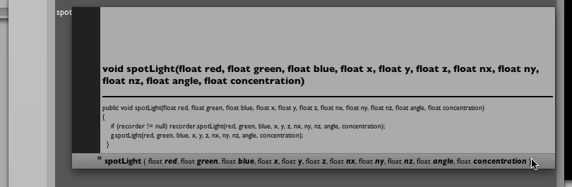 Some of the burden involved in writing code like this lightened by Field's autocomplete — pressing command-period after typing spotLi will give you assistance on the parameter names of spotLight and these names are hopefully things like color_red and position_x (the names are taken from the actual source code to PApplet so they never get out of date or need to be maintained). Currently, completion on spotLi gives: