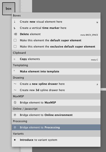 First you need to tell Field that the code in the box wants to talk to the Processing environment. A right-click on the box itself brings up: