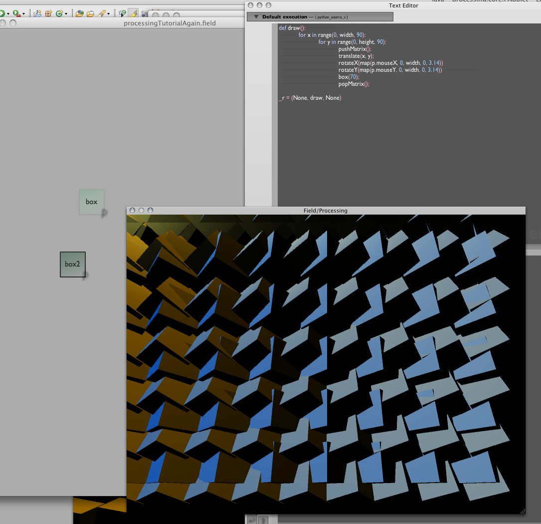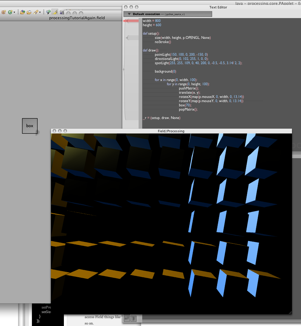 Firstly, the prerequisites: this tutorial is written for an audience that's familiar with Processing, familiar with either Java or Processing "Java-Lite" language, and not very familiar with Field or perhaps Python — the primary (but not the only) language that Field uses.