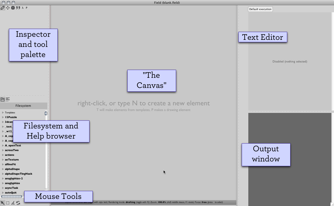 Secondly, the punch-line: anything that you can do in Processing you can do in Field with one exception: authoring Java applets for web-pages. Field wraps Processing; Field hijacks Processing; it accesses the same extensions and libraries, and yet offers a far wider range of technologies for the "improvising programmer" — our bet is that with Field you'll be writing code faster, and scaling your projects to greater breadths than Processing has been designed to promote. We think that Field fundamentally changes the nature of Processing development — cleaving what's known as "Processing" into two parts: the first a vibrant community of people using and sharing Java-based libraries for making interesting things and the second a rather conservative and minimal development environment and language that's currently boxed in by its need to be "simple". Field isn't simple.