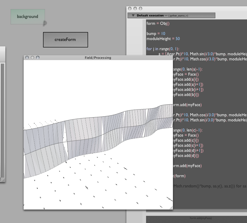 First, a couple of important long pages for those coming over from the Processing environment. ConvertingAProcessingApplet is a long introduction to converting a Processing app into one that uses Field's Processing Plugin. If 2d drawing and printmaking is interesting, take a look at AProcessingTree, which converts a simple Processing exercise into Field's internal drawing system.