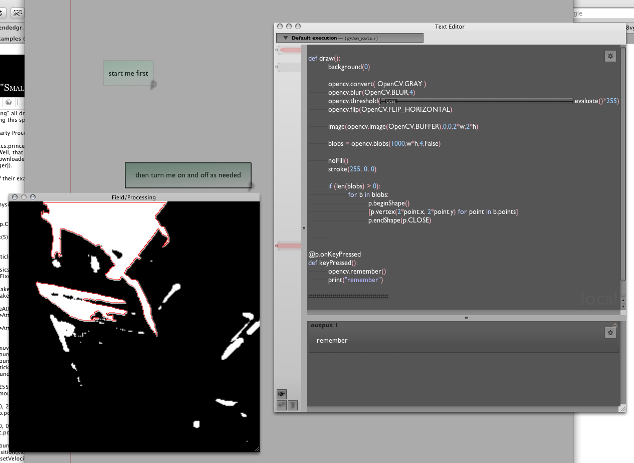In this example we transform what would have been a single file of a Processing Sketch into two Field boxes. Why? Well, the key thing is that we'd like to be able to experiment with code as fast as possible. While eliminating Processing 'stop-compile-go' cycle means that things are generally faster to play with in Field we can do better. This OpenCV library does a lot of work to set itself up properly — find the camera, start streaming information from the camera and so on. Ideally we'd do that once, and only once. So we move that work off to someplace else; it's own box. We start that, while we are writing the other box — the code that actually does something with the image. That code we write fairly live — line by line, looking at the contents of the OpenCV.BUFFER at each step along the way. Only at the end do we wrap that up in a function and make the box "runnable" with the variable _r. Even then starting and stopping this box is as simple as hitting command-PgUp and command-PgDown (or option-clicking on the box. This piece of code starts and stops instantaneously, the camera is constantly running.