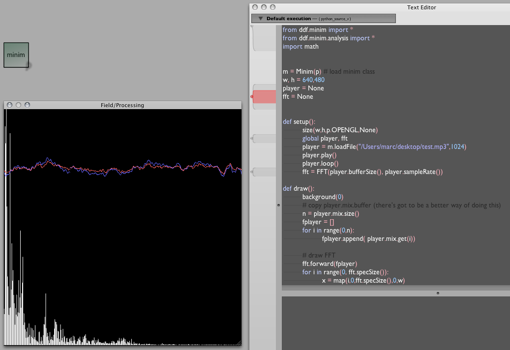 Here's a very simple conversion of a ANAR+ example into Field/Processing/Python. We are going to have two boxes, one that holds our initialization code and our very minimal draw function: