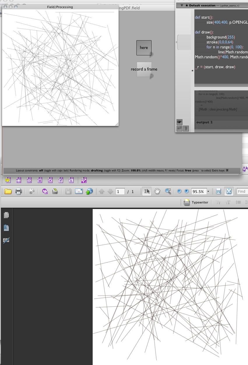 FLineThat's the story for Processing/PDF/Field/Python. For Field itself you might want to take a close look at Field's own 2d / 3d-ish drawing system which is less about dynamic animation and more about static geometry. The documentation starts here — BasicDrawing — and continues through DrawingFLines, DrawingFLinesProperties, DrawingFLinesEditing, ThreeDFLines — and then gets to the bit that we're are interested in here ExportingPDFs.