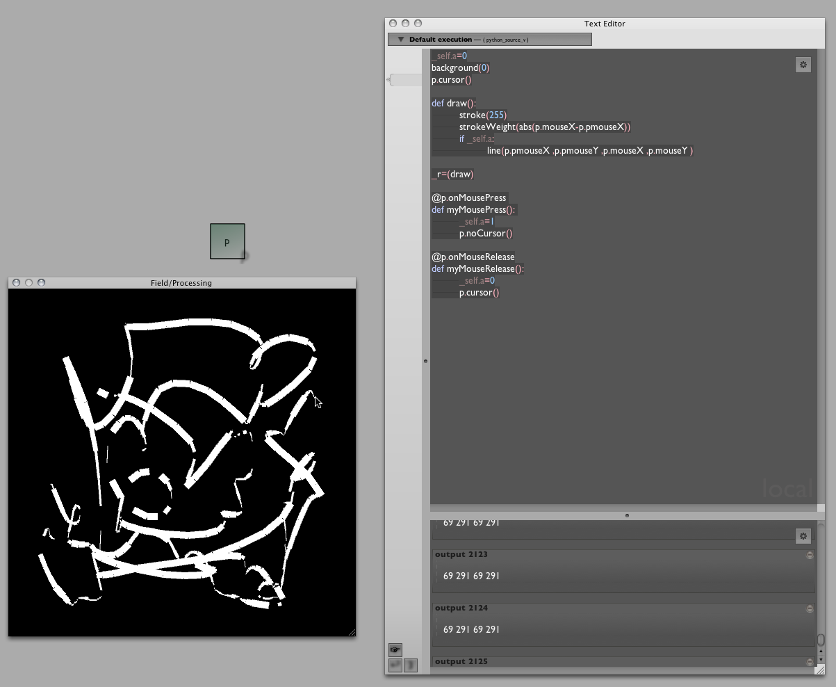 Note especially how Field handles the event handlers that this demo calls for. Since Field can have any number of boxes "running" all drawing things to the Processing window, Field lets you install, reinstall and uninstall event handlers using this special '@' syntax. Check out the longer tutorials for more examples.