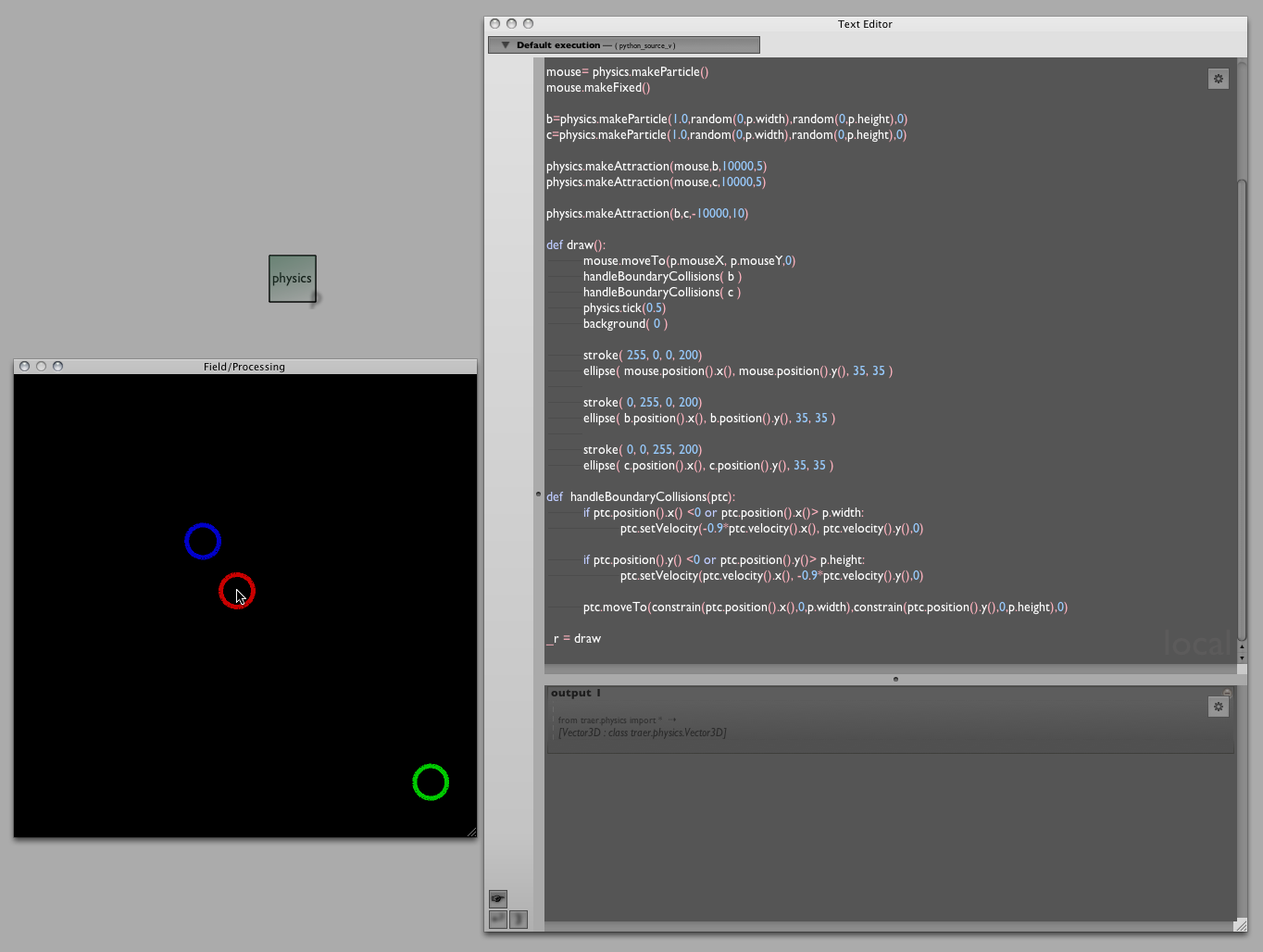 This code, when stuck in a Field box and run, yields a little interactive physics demo. Mouse over the Processing window to drag the 'attractive' red circle around: