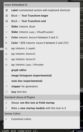 In case you didn't know, Field's "text" editor lets you embed graphical widgets directly in the source code. We've been trying to keep these widgets rather elemental — sliders, points, buttons, graphs and so on. That is: we've been trying to find widgets that are purpose neutral, and just help you "write" code for things where the "writing" part would be boring.