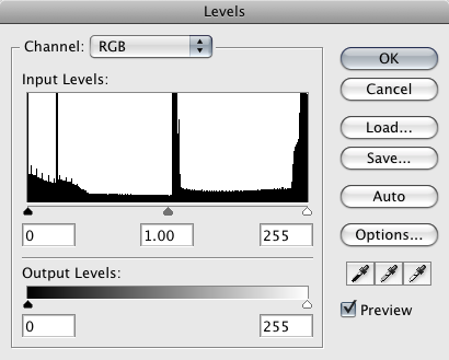Want to modify this mapping? Play with the black, grey and white boxes at the top and bottom of the histogram. If you've spent any time in Photoshop, what these things are doing will be very familiar:
