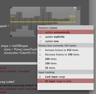 This just prints the quantity in question to the output box below the text editor. I'm certainly glad that I'm doing this in a "live" environment. Soon after I've done that I'm scrolling back through the text output to get a "feel" for the data. It's mostly near 0 but occasionally there's a 10 or a 20 - something. Complicated enough that I have to keep looking...