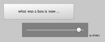 The Slider we just created can be slid around just like any other JSlider you've met. There's a real issue concerning when mouse events should be propagated to the Swing component — if you try to drag the visual element around, should that "drag" drag the frame (just like it normally would) or send that drag onto Swing (to, say, drag the slider around). Right now for components with isText set to 0 we have the following rule: if there's no modifier keys held down, it goes through to Swing. Otherwise, it's interpreted just as Field would normally interpret the mouse event. If isText is set to 1 then interaction defaults to doing Field-things, unless you double click to "open" up the component. Clicking anywhere outside the component, closes it back down again, and you can continue to interact with the rest of Field.