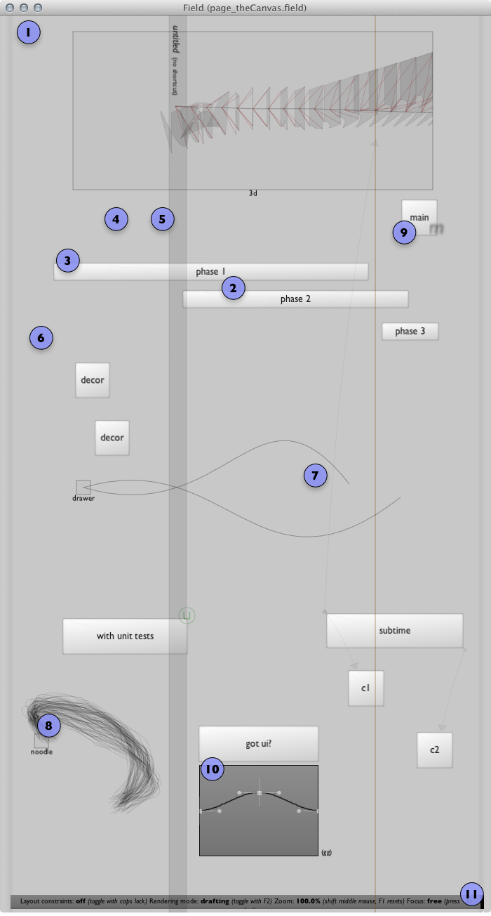 Just as you can embed GUI elements inside the TextEditor, you can also embed sliders and buttons and graph widgest inside the canvas itself. Field supports two approaches — using the same minimal style widgets as the text editor (see EmbeddingGuiOnCanvas) or using Swing components directly (see SwingIntegration).