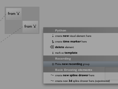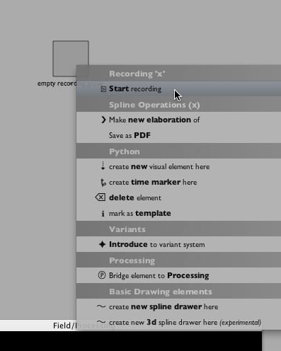 One final rule, hinted at above: the boxes that the recorder creates are always "subelements" of the things that they record (take a look at SelfAndProperties if this doesn't make any sense). This means that the newly created elements delegate the looking up of _self to the original elements. This gives you lots of things for free — firstly, you don't need to worry about code in the boxes referring to things like _self.somethingorother — these references are still valid in the newly created elements. Secondly, because Field uses _self for all kinds of internal magic lot of things "just work" in the subelements — for example, elements that are "bridged to Processing" get recorded correctly.